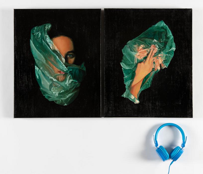 Alexandra O’Brien I’m all ears 2018. Oil on canvas, audio file and oil on headphones, three parts: two at 50.5 x 40.5 cm each; Headphones with audio: duration 2:42 min. Iona Presentation College.