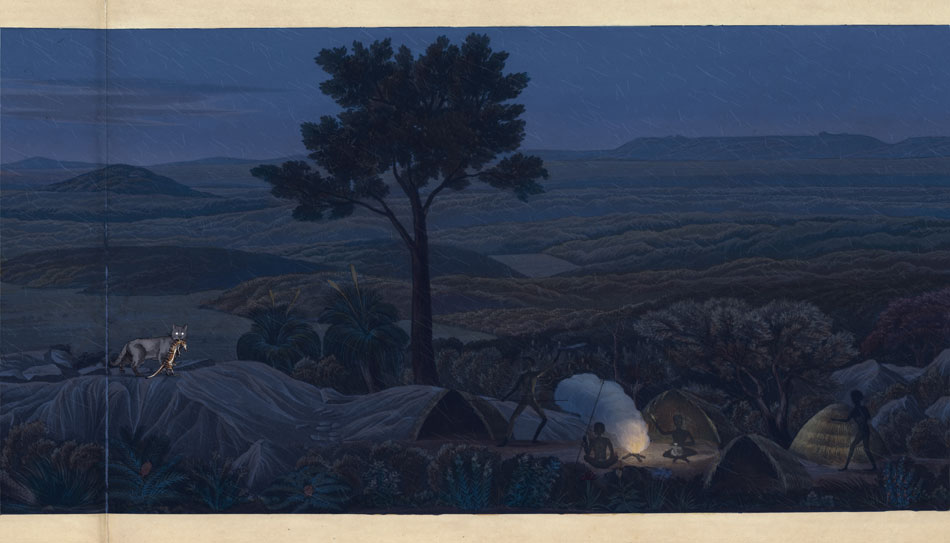 This work has also been reimagined by other Western Australian artists, Christopher Pease and Gregory Pryor, so those works feed into the dialogue around this one. A key link has been conversations with (Menang Noongar Elder) Lynette Knapp and (WA botanist) Stephen Hopper. Stephen Hopper had actually just done a couple of lectures on the fact and fiction of the Dale panorama. So I went and spent some time with the two of them, using Stephen’s scientific background and Lynette’s Menang/Noongar knowledge. And we just did these passes across the painting and all of this detail came out of that. Obviously we can’t include all of that detail, so there’s this emotional, intuitive response which comes out in the work; a simple shift from day to night, from summer to winter storm, this rain like tears when these monsters begin to appear.