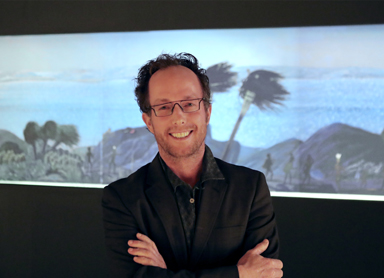Perth Media Artist Sohan Ariel Hayes with his work Panoramic View of Albany (Kinjarling), The Place of Rain (2019).