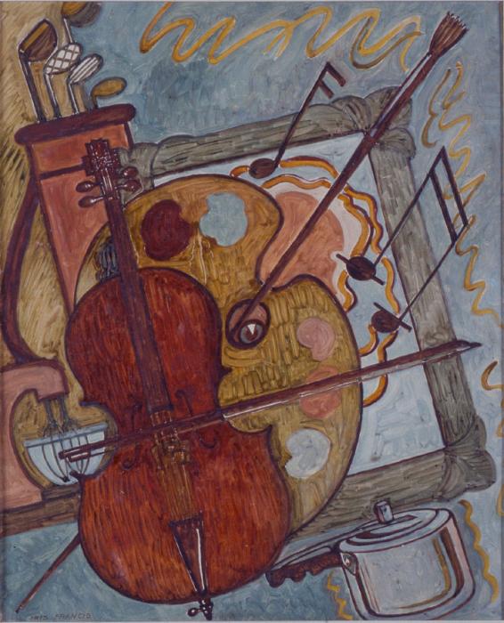 Breaking with the convention of depicting a physical self, Iris Francis’s Self Portrait 1940 is an arrangement of objects that represent various aspects of the artist’s everyday life. Golf clubs, pressure cooker, frame, palette, ‘cello, speak of household labour/duty, leisure and creative activity. While the eye that peers directly out of the thumb hole of the palette might suggest visual art unifies these elements, it equally might indicate that art and its symbols are a mask.