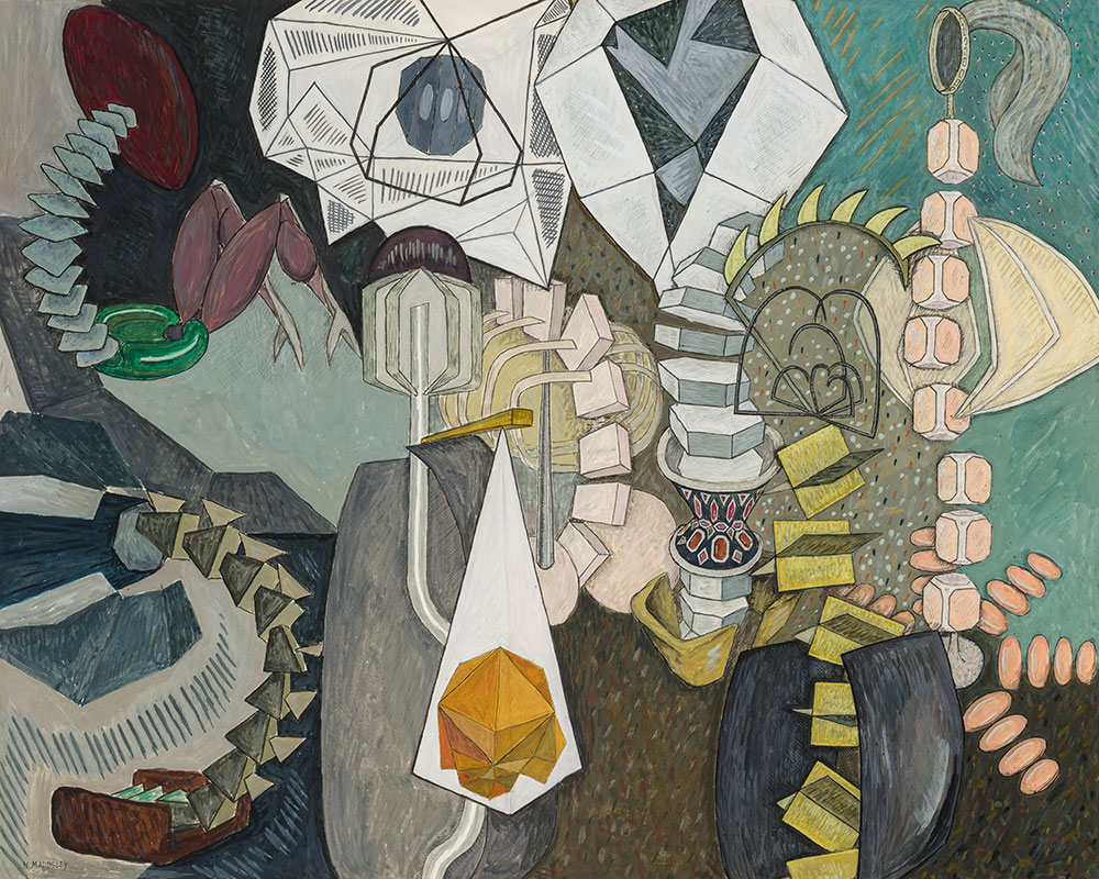 Helen Maudsley is a senior Australian artist whose work should be far better known than it is. During her seventy-year career, from her first solo exhibition in 1957 to her most recent in 2021, she has pursued and refined her artistic vision. Maudsley’s complex works have their genesis in the physical world around us, but she works with form and composition to write ‘essays’, which are intended to be read. Maudsley’s highly personalised motifs and complex compositions demand that the viewer spends time looking at the image. As she puts it, “we need to watch the associations that arise in our mind while looking and give the combinations of shapes the opportunity to act on our imagination.” The charming ladies was made early in Maudsley’s career and is one of a series of images in which she has abstracted the female form, retaining some figurative elements within its surrealist-inspired approach.