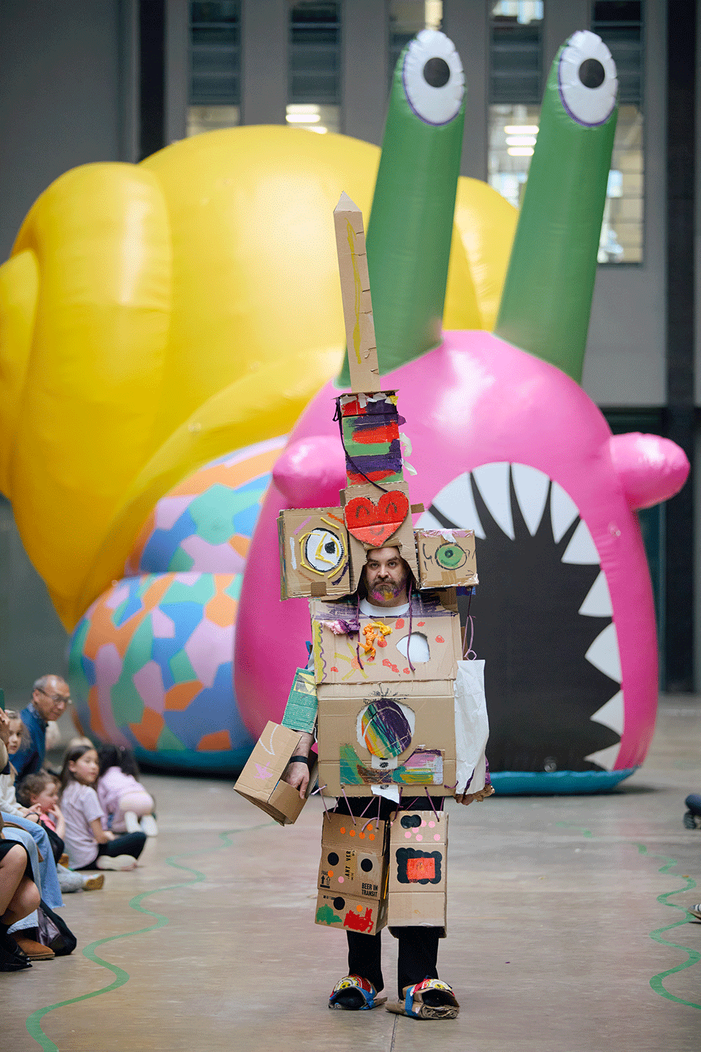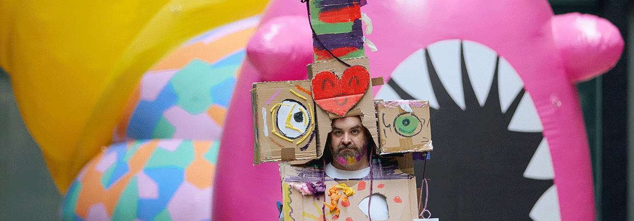 Bruce Asbestos’ work centres on attention, and how visibility, spectacle, and participation shape pop culture. Working across sculpture, performance, painting, clothing, and large-scale installation, his practice uses characters and pop imagery to explore how audiences gather, follow, and engage within cultural systems.