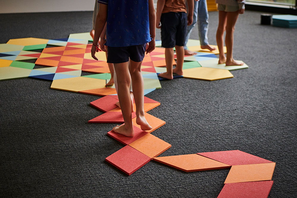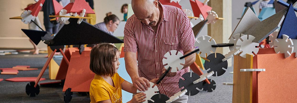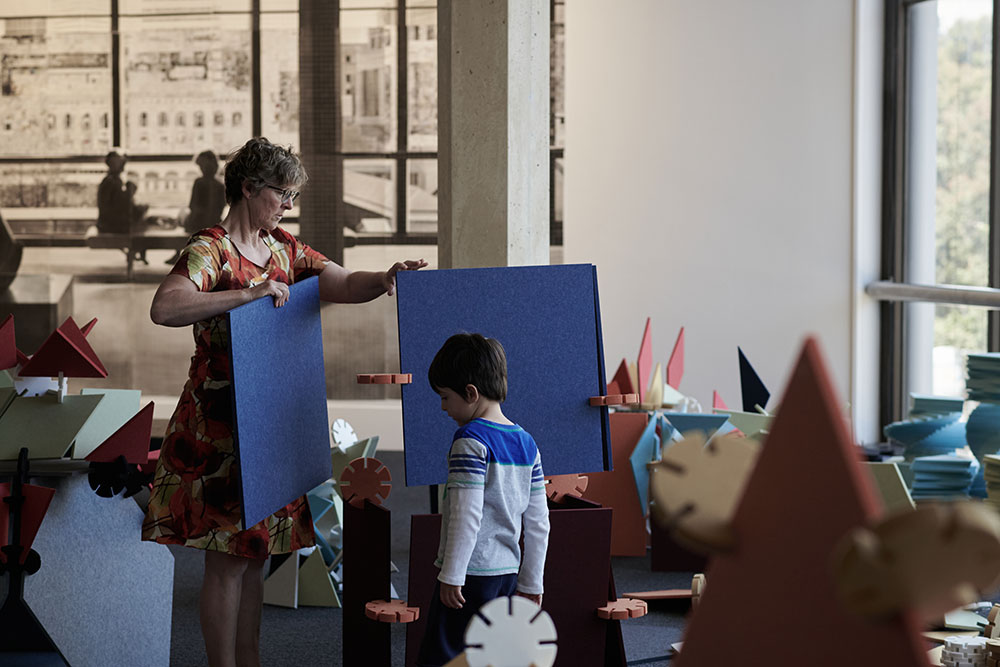 Families are invited to look OUT the newly revealed windows to the skyline, BACK in time to what the city might have looked like before, and IN towards the building’s architecture. Come and create sculptures, cubby houses and 2D designs with colourful geometric shapes made from a light acoustic material called Autex, designed to be sensory and accessible.