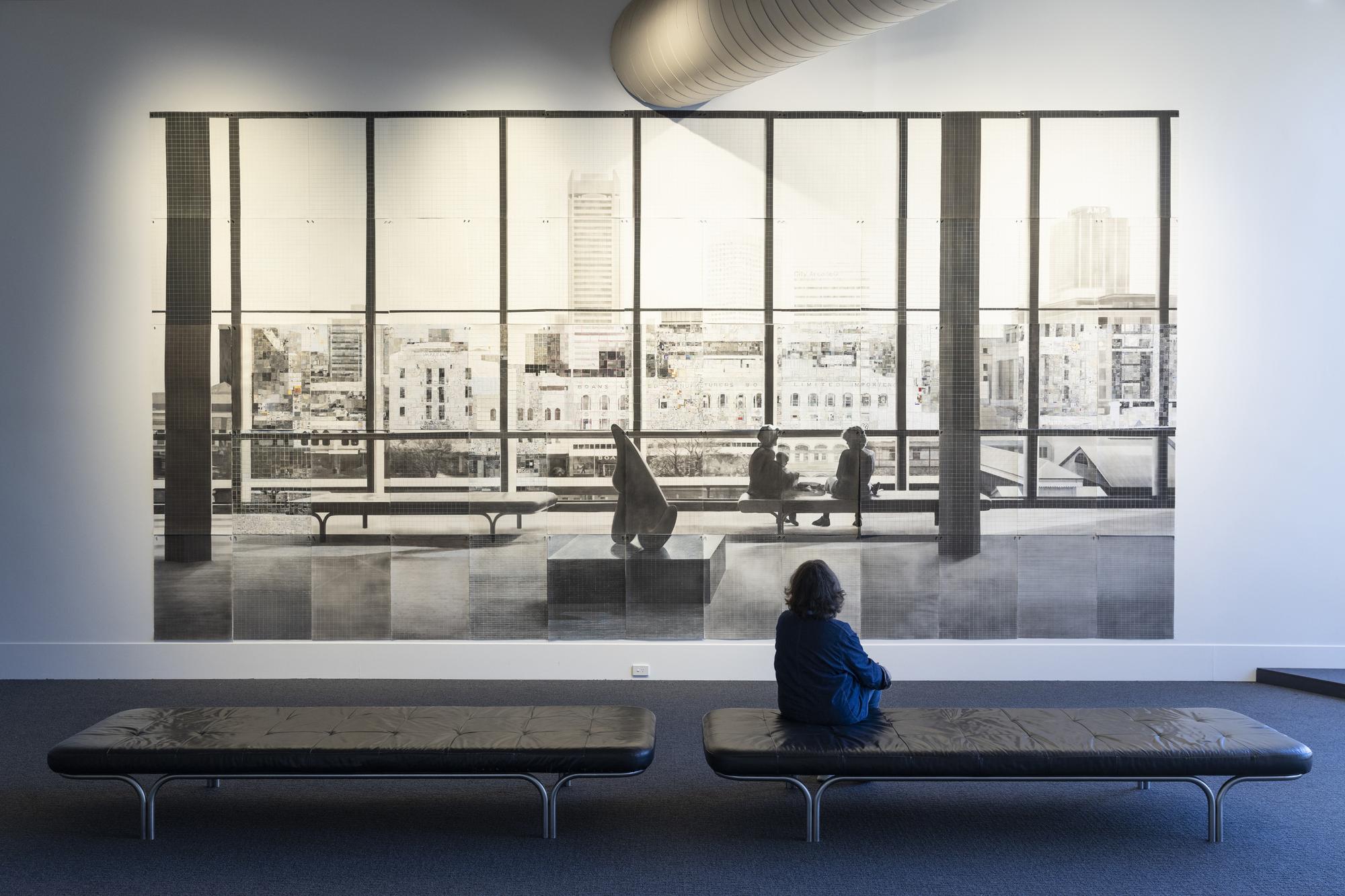 Looking Out/Back/In also includes an enormous monochromatic multimedia drawing by Eveline Kotai called Skyline/Timeline created across 65 separate pages in response to a black and white photograph taken out the gallery window in 1979.